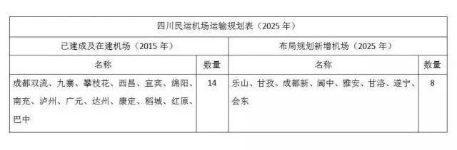 分别是乐山、甘孜、成都新、阆中、雅安、遂宁、甘洛和会东。截至2015年底,四川已建成及在建机场有14个,分别为成都双流、九寨、攀枝花、西昌、宜宾、绵阳、南充、泸州、广元、达州、康定、稻城、红原、巴中。这样,到2025年,四川布局规划机场共22个(注:不能等同于建成)。
