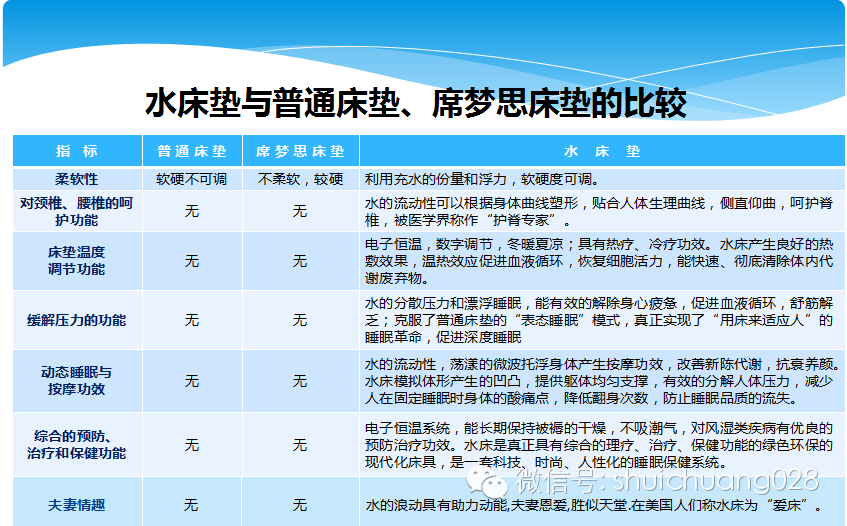 据2011年的统计资料,在法国睡水床的人口比例是4%,德国20个人中有1人睡水床,占5%,在美国比例还更高达到10%以上,且近年来,选购水床的欧美顾客有快速上升的趋势