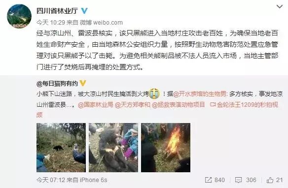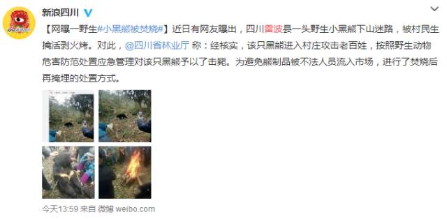 当日下午,四川省林业厅微博回应称:经与凉山州、雷波县核实,该只黑熊进入当地村庄攻击老百姓,为确保当地老百姓生命财产安全,,按照野生动物危害防范处置应急管理对该只黑熊予以了击毙。为避免相关熊制品被不法人员流入市场,当地主管部门进行了焚烧后再掩埋的处置方式。