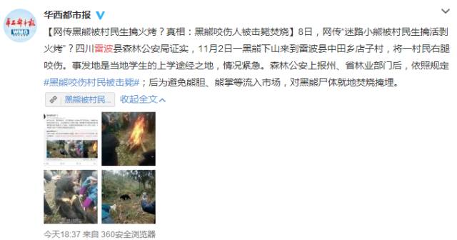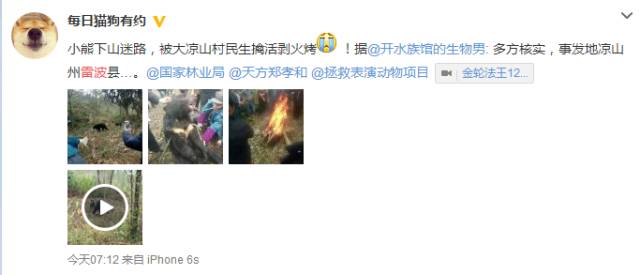 11月8日,据网友“每日猫狗有约”爆料,四川雷波县一野生小黑熊下山迷路,被村民生擒活剥火烤。