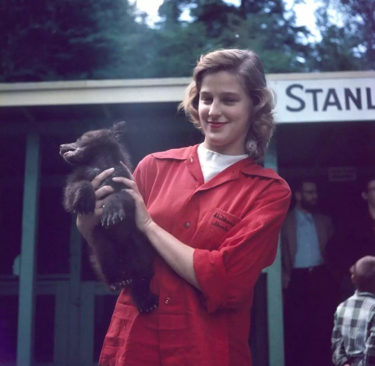 儿童动物园的饲养员正抱着一只小熊(如果你仔细看,会发现饲养员脖子上有一只小老鼠)