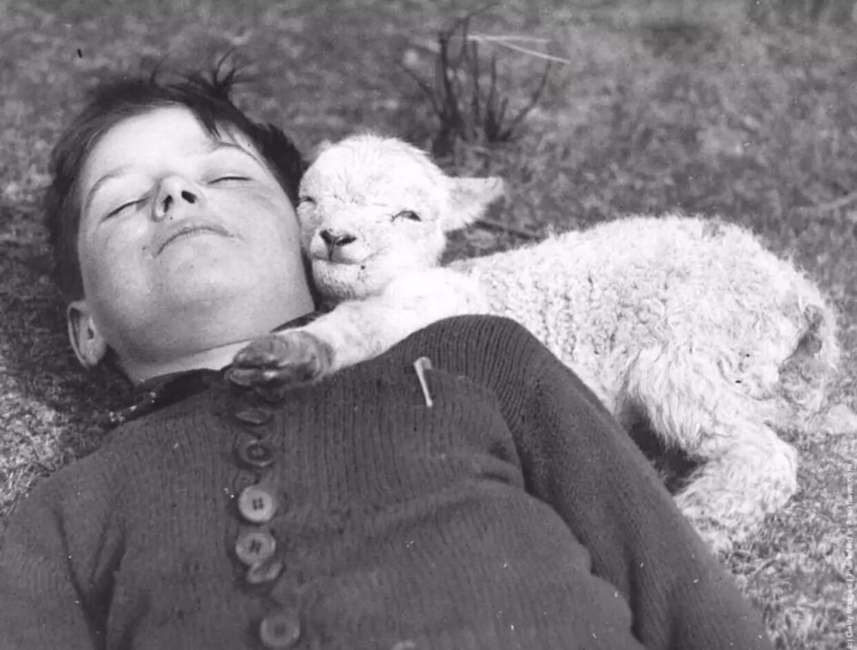 刚出生不久的小羊羔依偎在小主人的身上