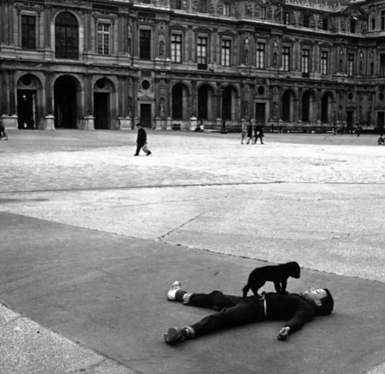 巴黎卢浮宫前小男孩和他的小狗在玩耍