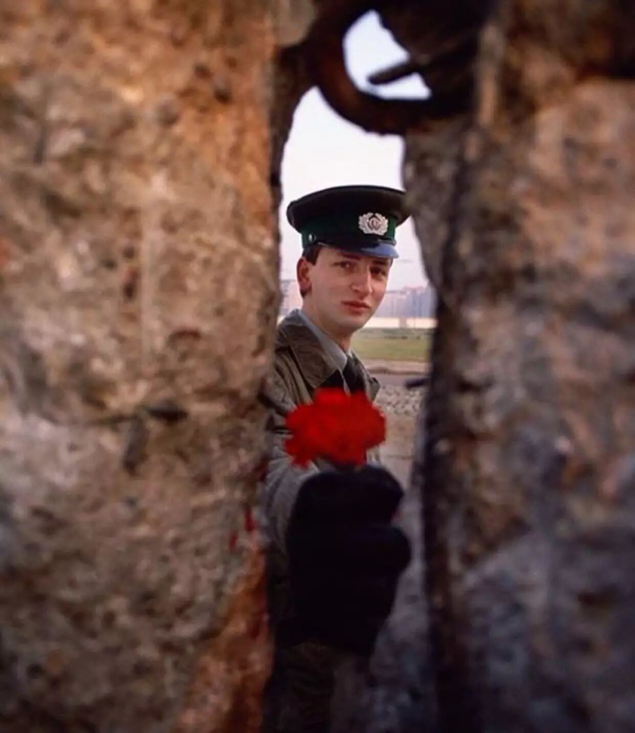 德国边防战士在柏林墙倒下的那个上午从缝中递上一支玫瑰