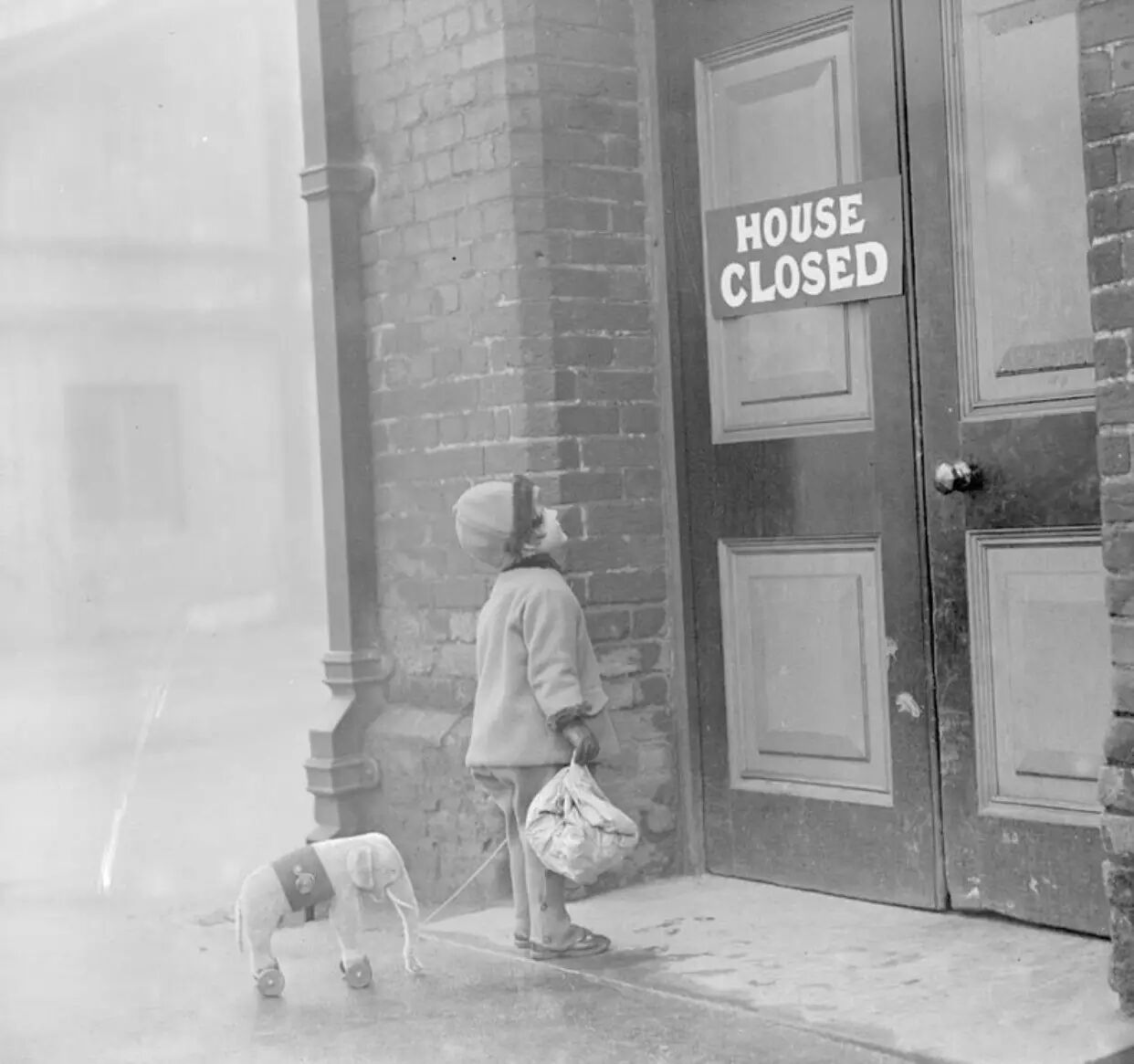 一个小女孩带着她的玩具象来到发现已经关门了的动物园大象馆