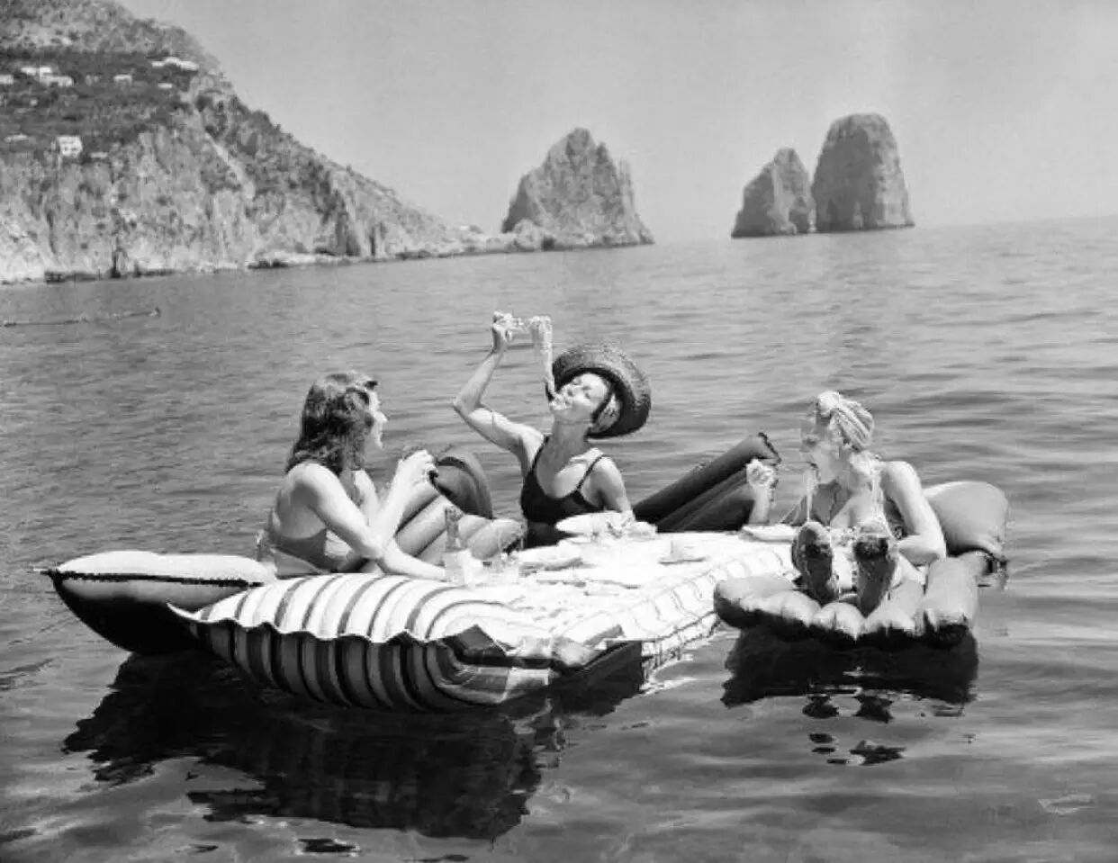 卡普里岛上,三位年轻女孩在海边漂浮着的充气床垫上吃着意面