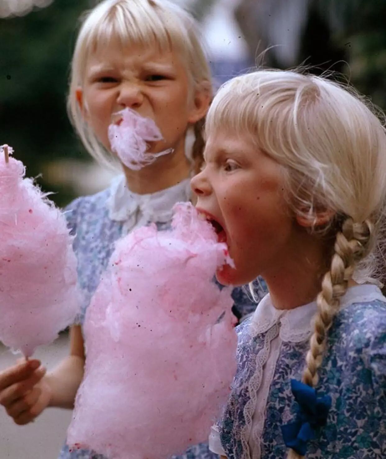 在丹麦,两个小女孩吃着刚刚收获的粉色棉花糖