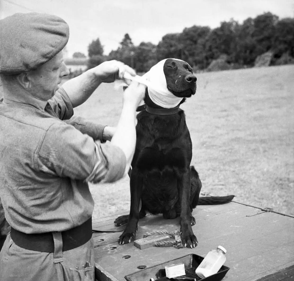 士兵正为一只探测警犬Jasper包扎受伤的耳朵,法国