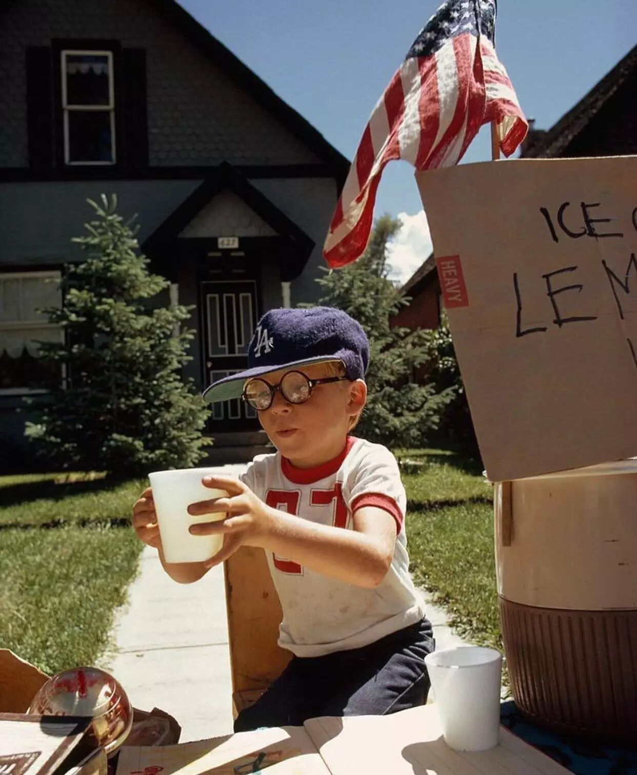 一个小男孩在自家院子前售卖柠檬汁(美国小孩赚零用钱必备方式)