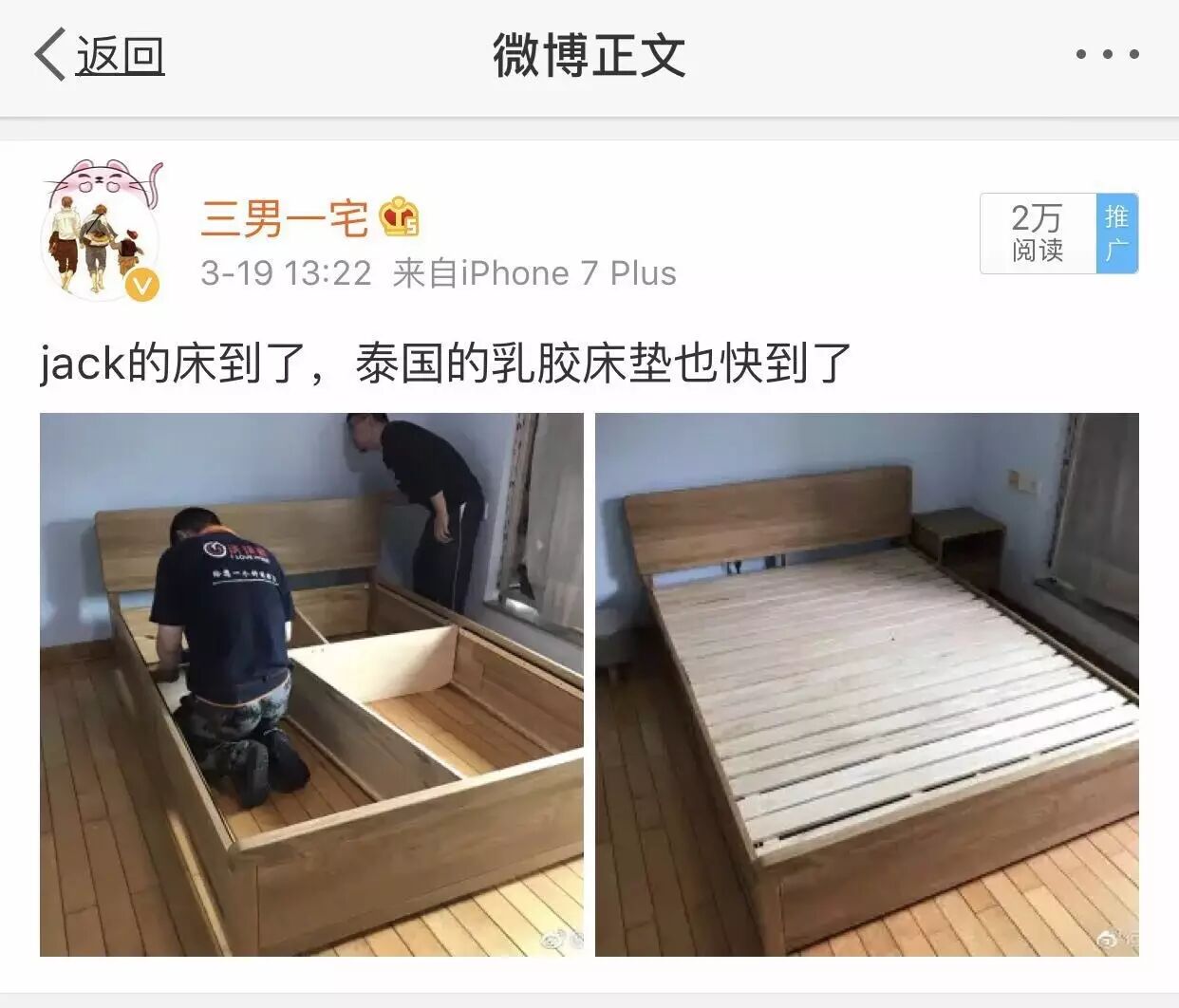 床是周日送到的,当时就发了条微博,不过很多网友的关注点偏了——都注意到安装床的小哥的翘臀了,也是够了▼