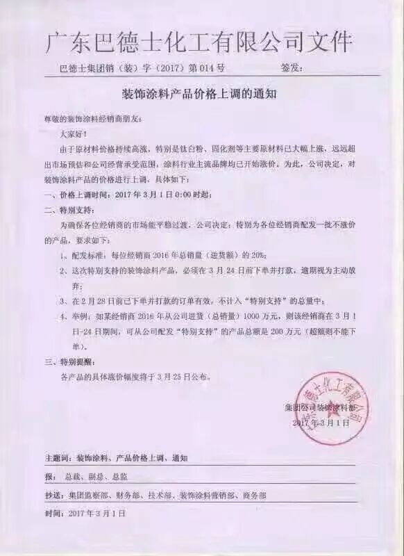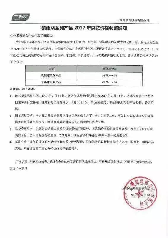 面临原材料持续不断地涨价,涂料企业忍气吞声地度过了2016年。2017年,原材料涨价依然猛烈,已经有相当一部分的涂料企业已经到了亏损的边缘,已经到了不涨就死,涨了就丢客户的尴尬境地。近日行业内的带头大哥终于出现了,这次这几家行业的龙头企业带动涂料企业涨价,很快会引发行业内的骨牌效应,带动国内的大批其他涂料企业跟进。