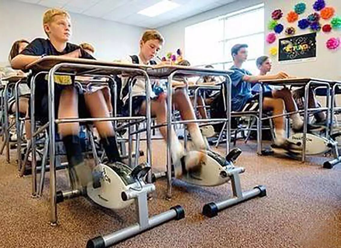 为防学生开小差,数学老师也是操碎了心美国北卡罗莱纳州马丁中学的一位数学老师发现,学生上课特容易开小差。她想了个招儿,在课桌下安装自行车脚踏板,让学生们一边运动一边上课。她称该方法实行一年多来,孩子们普遍更能集中注意力听讲,成绩稳步提高。