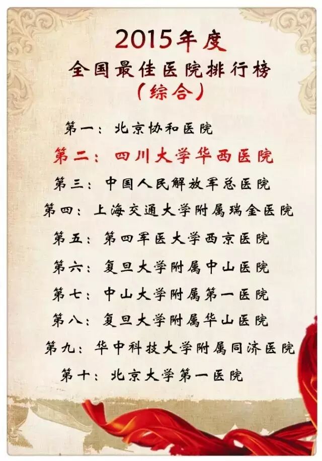 复旦大学医院管理研究所邀请全国37个临床专科的2490名国内著名同行专家担任评审的《2015年度中国最佳医院综合排行榜》和《2015年度中国医院最佳专科声誉排行榜》在上海发布,全国100家最佳医院和37个最佳专科名单揭晓,四川大学华西医院名列两个榜单第二名。